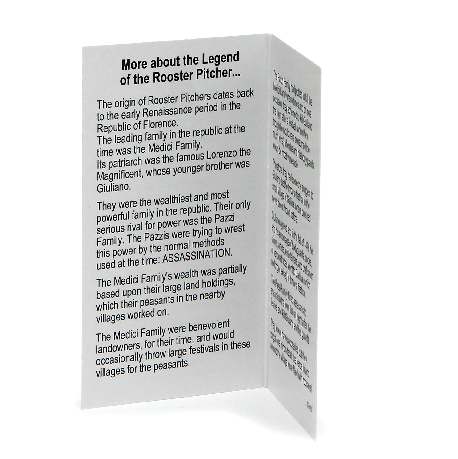 Every rooster pitcher is accompanied by a card with the Rooster of Fortune legend.